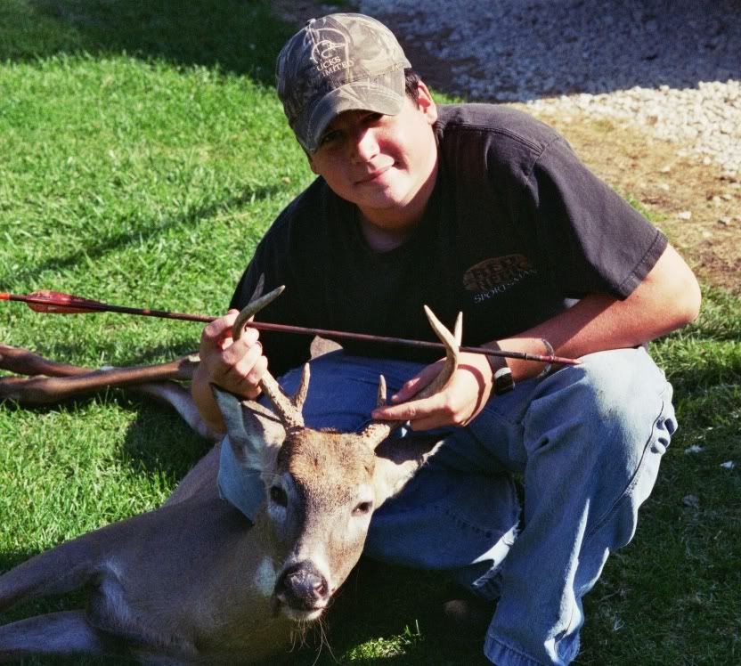 i am bored so i figured i would post the story of my buck from last year. so here we go. i got into my stand on a balmy october morning and felt the cool wind and realized i am glad to be alive and have the life i have. so after that little moment i settled in and saw nothing until this little guy comes out of nowhere and suprises the heck out of meat about 8:05 am. and since it was my first bowkill i was going to shoot him. well i waited and watched him and took in the beauty of him. then i said to myself, long enough now i have to shoot or he will get away. so i drew back, settled the pin, and released. a perfect broadside shot at 18 yards, though it was not a pass through he died within 30 yards i was so proud. and my father was estatic and he actually watched the deer drop after the shot. it was an amazin experience that i will never forget.