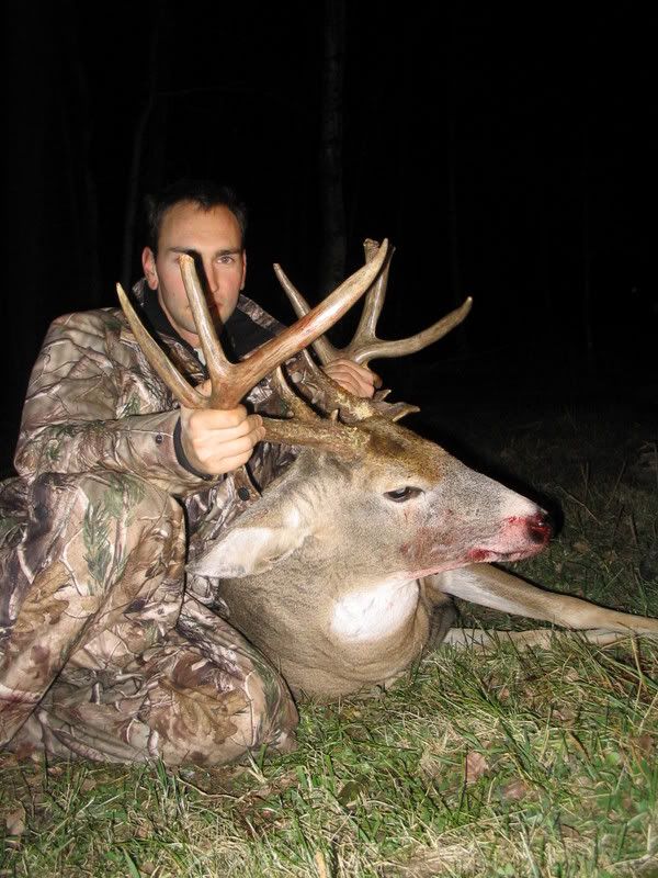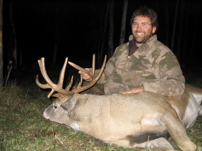 Which brings me to last night. We went back to try for the big guy again even though it was windier that h*ll. luckily the deer need to cross a wide open strip of pasture to get to the bush they stage in before heading for an alfalfa field. With about 1/2 hour left, I passed on a plain jane 4x4 that was a nice deer but just not that interesting. we repositioned a bit for the last 15 minutes and got lucky when a buck emerged following three does. With light fading we conferred and agreed that it was "the buck" as he appeared to have the same characteristics of "the buck" so I leveled off and shot. We backed off for an hour or so to get the flashlights and drop off the guns. We found blood immediately but the trail ran cold after only a few feet. We split up and walked about 50yds apart into the bush in the general direction the buck had taken. Luckily Mat found him within 150yrds. It turns out he was not "The buck" but as you can see from the pictures he has some non-typ stuff going on and a small droptine. Moral of the story: be damn sure the buck in front of you is "the buck" when shooting in low light.
