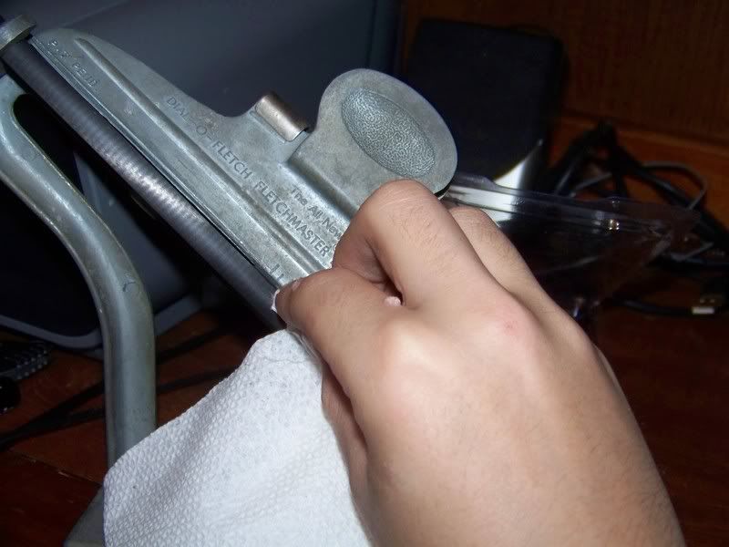 The next step is to place the vane in the clamp, remember to put the back end of the vane on the same mark everytime. After getting the vane situated like you want to, it's time to apply the glue. You want to go sparingly, so you don't have alot of excess (I have problems with this
