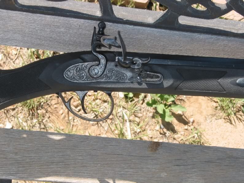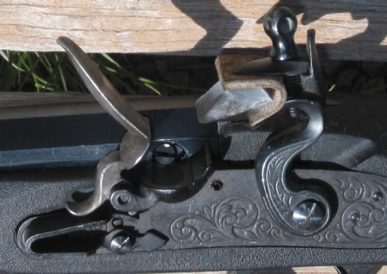After all the boys were done and things quieted down I got the chance to pull out my Bobcatwhich Irecently converted to flintlock and give it a first test. I first fired a squib load to verify it worked and to dry the bore of any left over stuff. The first PRB shot I had a flash in the pan, I must of not got the correct amount of primer in the pan. After that I shot 5 consecutive shots with no issues and only a slight hint of a delay from pan to main charge ignition. i didn't put up a target because of the 30mph winds that were blowing dust everywhere. I mainly wanted to test the gun for functioning and verify it would shoot. I did aim at several dirt clods that were near the berms and hit some of them and just missed the others at 50 yards so I guess its pretty close. Here are some pictures of the little cheap flintlock conversion. BTW, I have about $90 in this gun including the conversion.