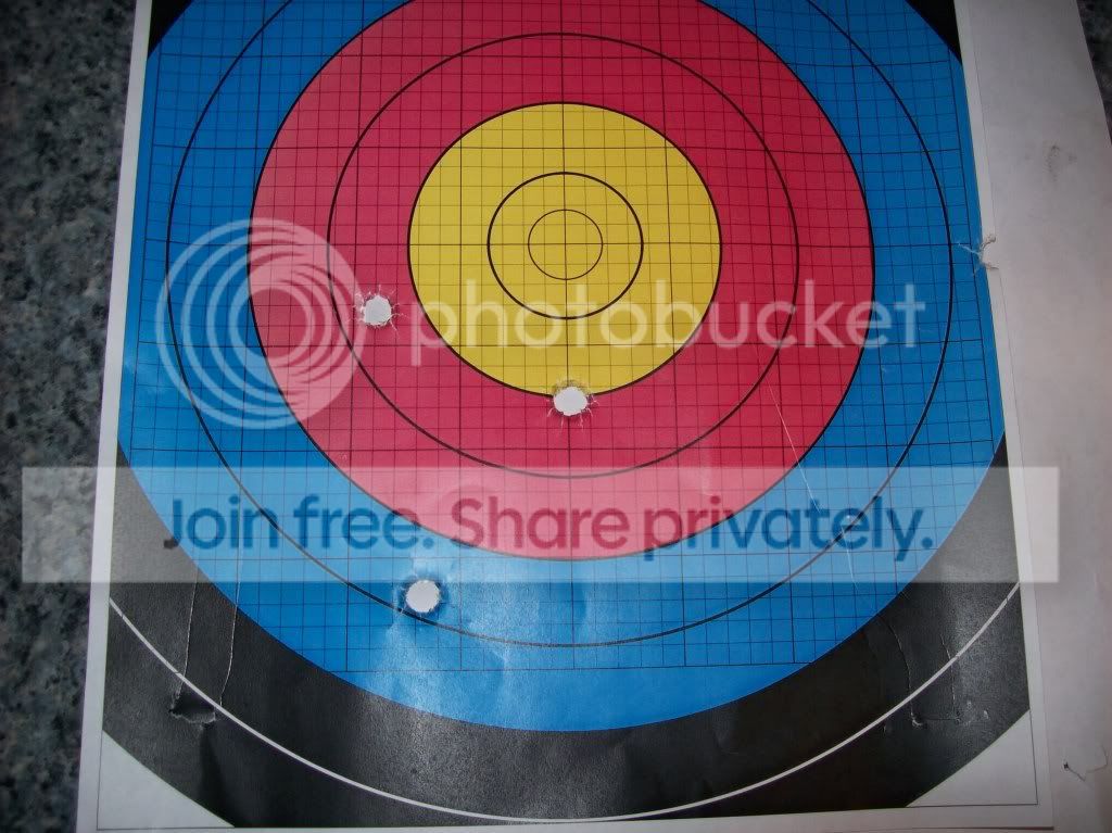 it was starting to get darker...I switch targets and droped to 70 grs rs pyrodex bullets were lower and 4th shot broke the paper at 3oclock I was haveing troble seeing it was 630