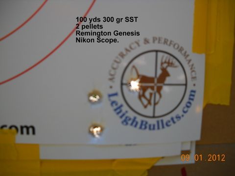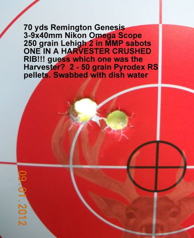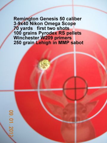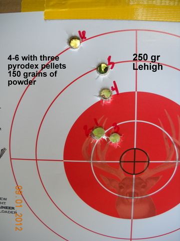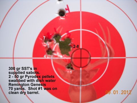 I was going to shoot more BlackHorn today, but really wanted to try Pyrodex RS pellets. My Genesis likes Pyrodex pellets for some reason. I know the Lehigh 250 should be pushed hard, but I am not a large powder charge shooter. So I started out with just two pellets. These were with a MMP hph 24 sabot.