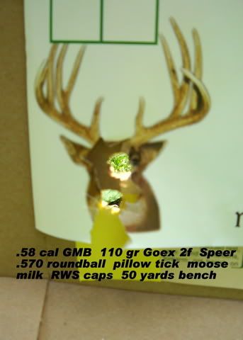 Wa-HOO! That's some mighty fine iron sight shooting Cayugad. I'm glad they worked for you. They take a harder whack on the short starter than do the .570's, but they shoot straight out of my GM barrel too. You're right about those 1:70 twist GM barrels. I don't know how they could shoot any better (heavy though). I sure hope I get a chance to put one of those balls through a deer this fall.