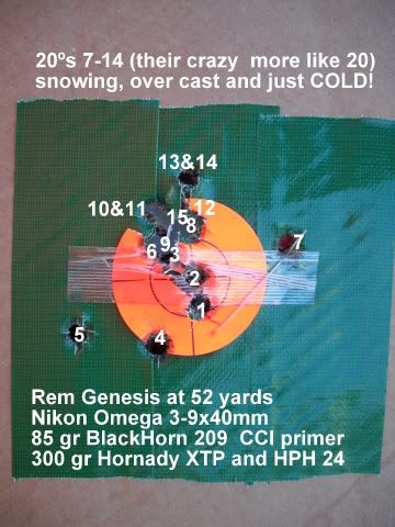 I had reduced the amount of BlackHorn 209 I was using at the suggestion of forum members. I believe it was Lee that suggested it. Well something must have been good about that advise. I shot the first two shots and couldn't ask for better with a rifle.