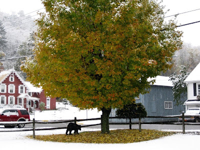 in mountains around clinton county is about 6 inchs of snow.it is on leaves heavy and wet.fog is terrible.drizzling as of now at 9 pm friday.sat just as bad on drizzle and cool weather /fog.